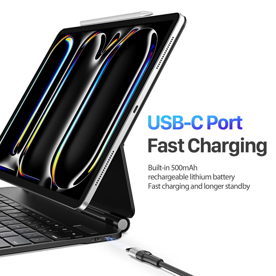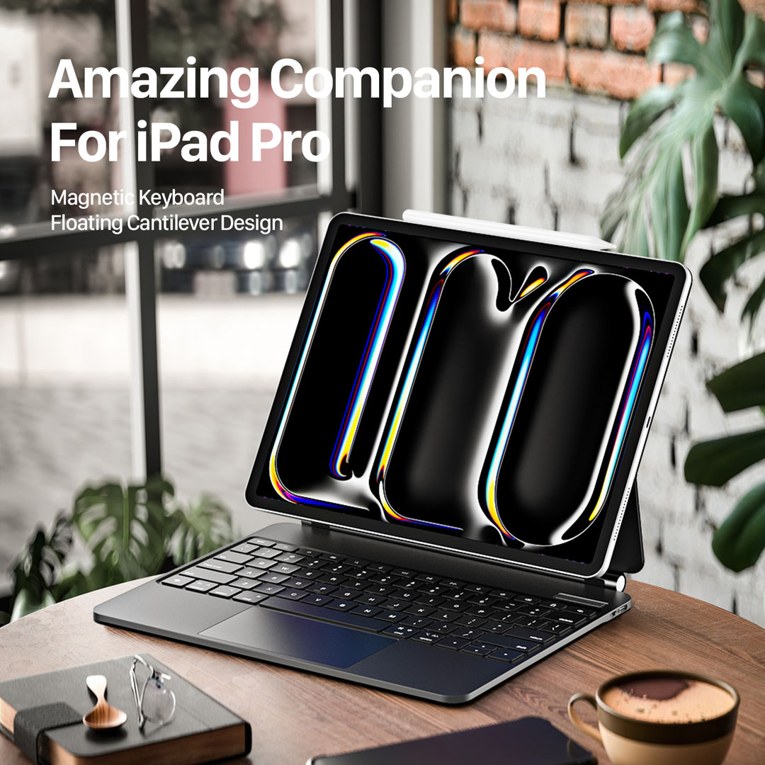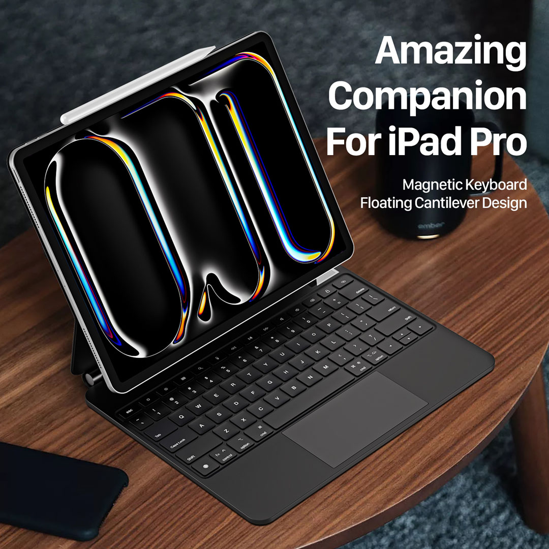 The package includes the keyboard case only. The package excludes a charging cable and other accessories. Furthermore, the keyboard fits the iPad Pro 13-inch M5 2025 and M4 2024 and connects to the tablet magnetically without a separate pairing cable. The case carries a keyboard, cantilever arm, and folio in a single package requiring no additional pairing hardware.