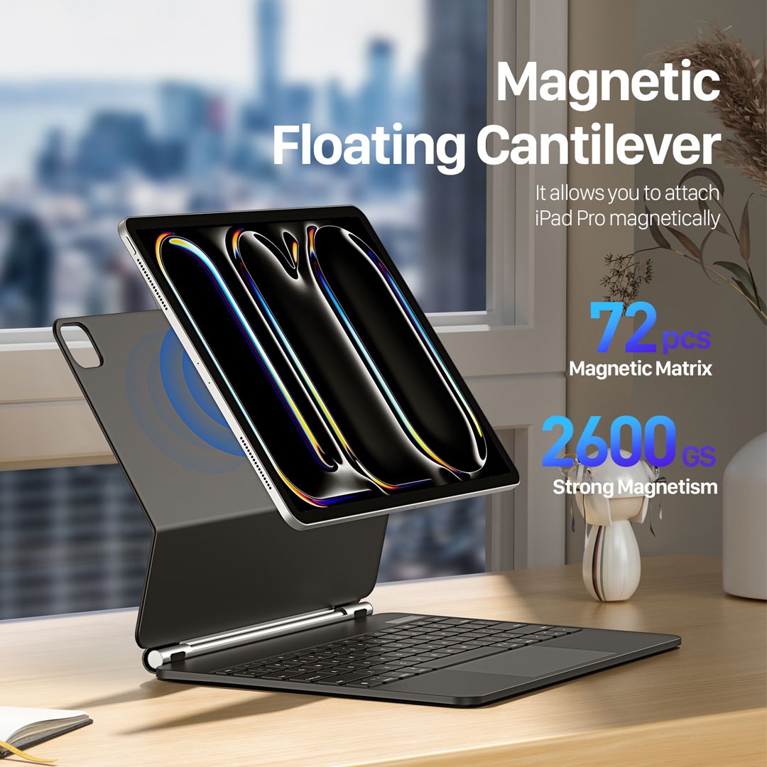 The iPad Pro 13-inch magnetic floating keyboard case is the Dux Ducis MK Series keyboard with protective folio for the iPad Pro 13-inch (M5). GA Tech NZ stocks this case at gatech.co.nz for customers across New Zealand. Furthermore, the 72-piece Magnetic Matrix at 2600 GS holds the Pro 13-inch on the floating cantilever arm at any viewing angle. Additionally, the 7-colour gradual backlit keys, 1.5mm scissor mechanism, and multi-touch trackpad complete the keyboard feature set.