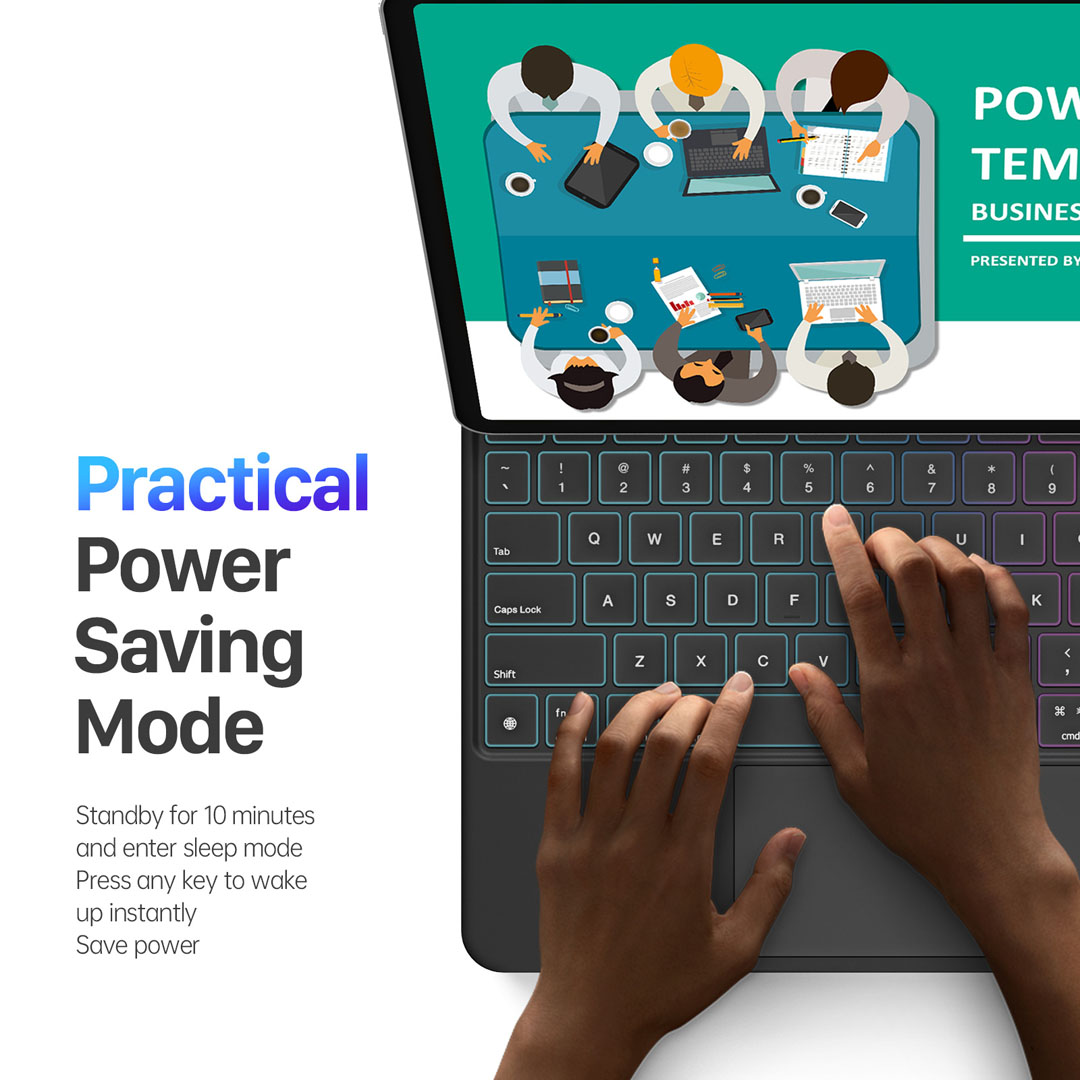 The keyboard includes 7-colour gradual backlit keys that allow typing across all light conditions. In addition, the scissor mechanism with 1.5mm key travel produces quiet and responsive keystrokes on a full-size layout. Moreover, the trackpad supports multi-touch gestures for navigation, cursor control, and scrolling without lifting hands. The case suits typing, drawing, video calls, and portable carry across work environments. When not at a desk, the folio folds flat for carrying. Furthermore, the backlit keys cycle through 7 colour options, allowing a preferred backlight for any environment.