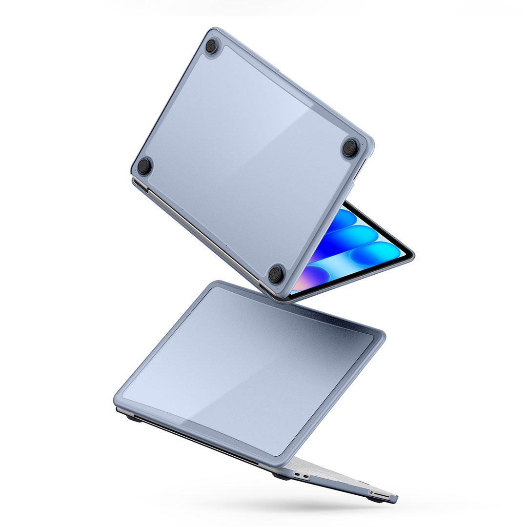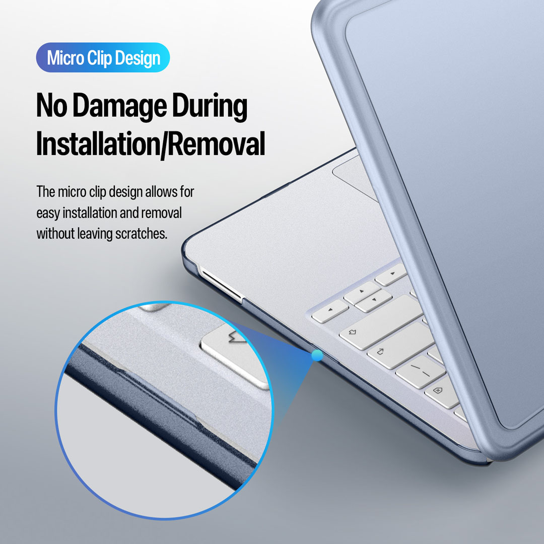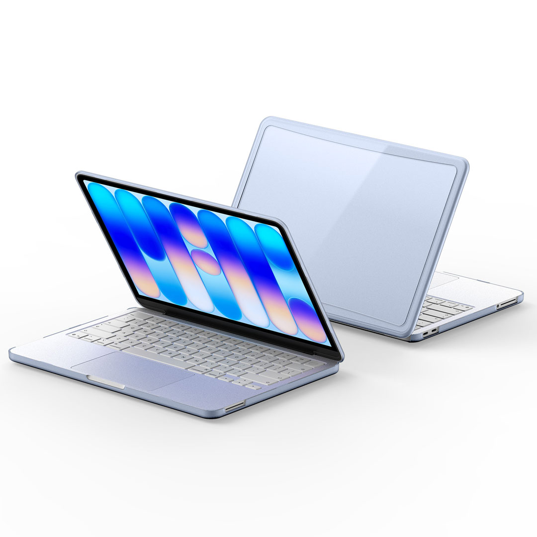 The dual-texture construction separates the coarse matte frame from the fine matte top cover across the two pieces. Furthermore, the coarse frame provides grip during handling while the fine top cover protects the lid surface. The precise cutouts on all sides keep every port, vent, and USB-C connector accessible without case removal. Moreover, the case does not affect the opening and closing angle of the laptop lid during use. The minimalist matte blue design keeps the MacBook Neo profile low during use and storage on any surface.