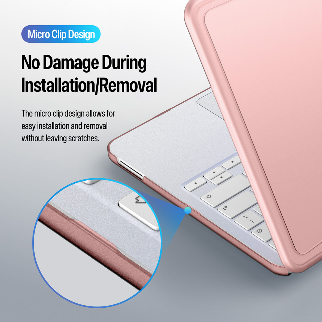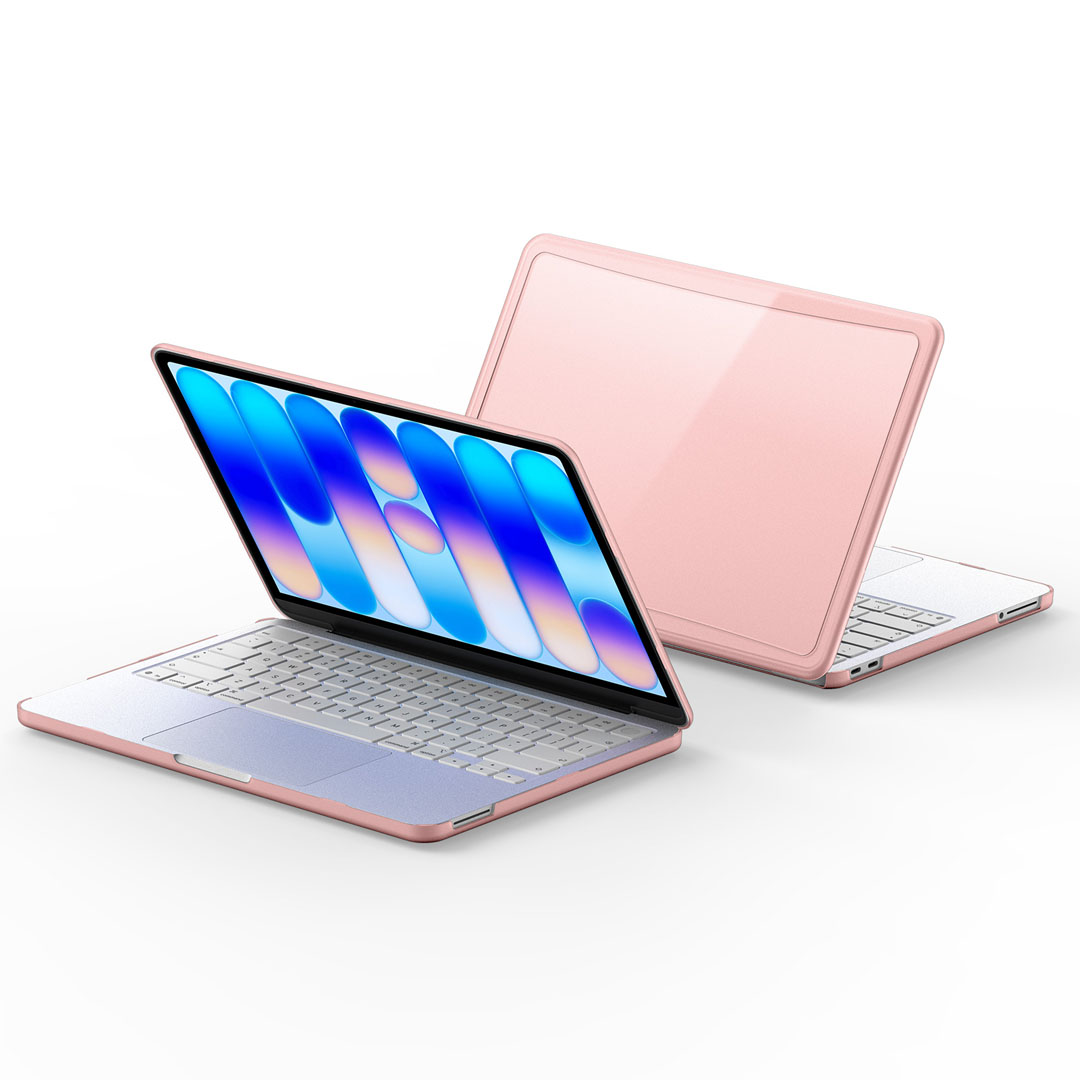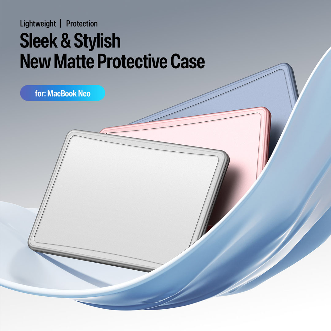 The dual-texture construction separates the coarse matte frame from the fine matte top cover across the two pieces. Furthermore, the coarse frame provides grip during handling while the fine top cover protects the lid surface. The precise cutouts on all sides keep every port, vent, and USB-C connector accessible without case removal. Moreover, the case does not affect the opening and closing angle of the laptop lid during use. The minimalist matte pink design keeps the MacBook Neo profile low during use and storage on any surface.
