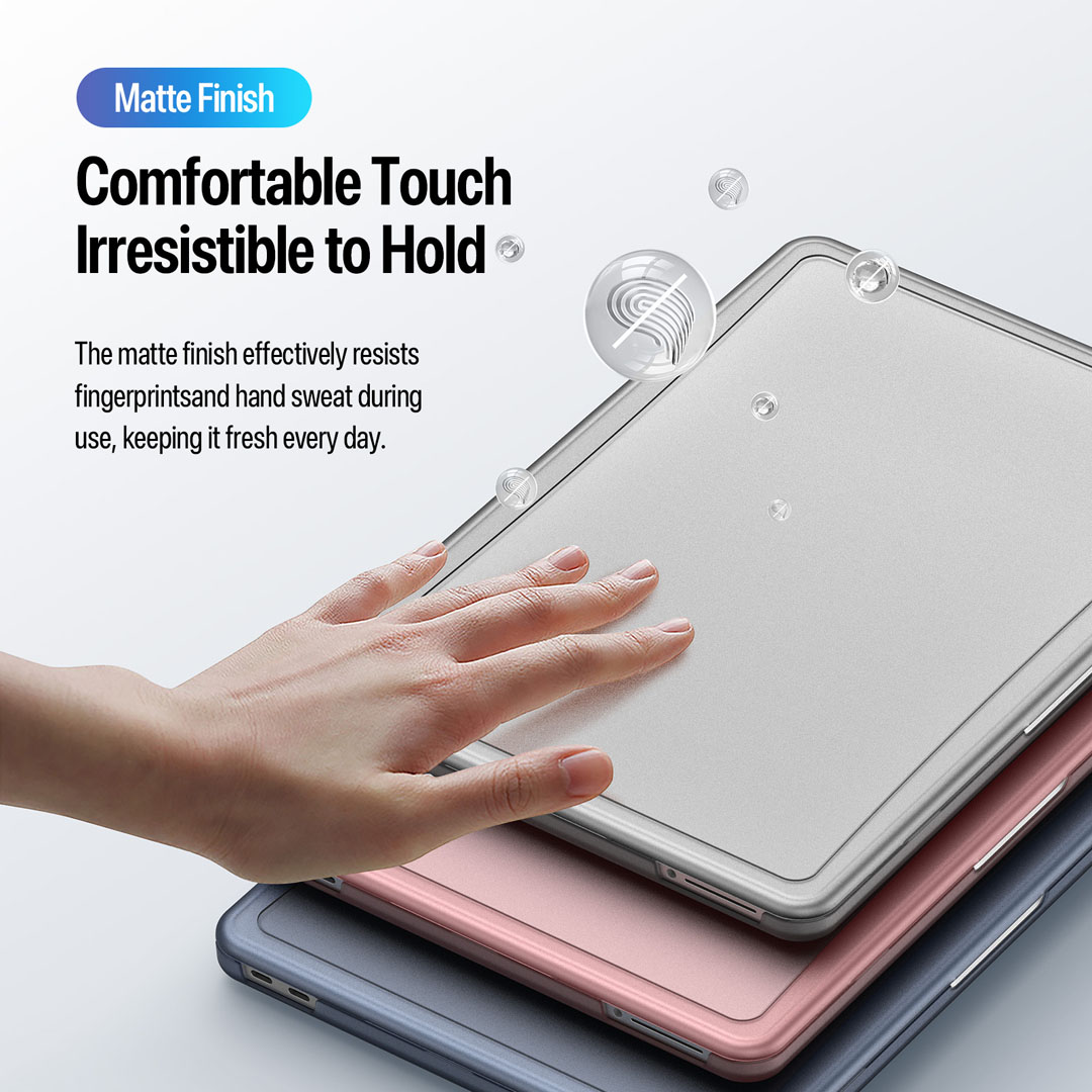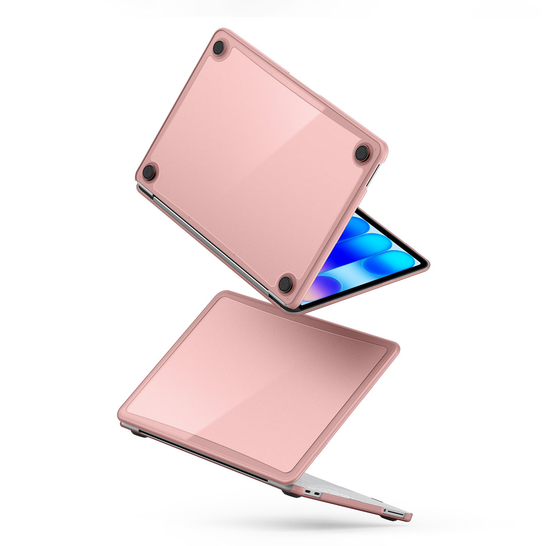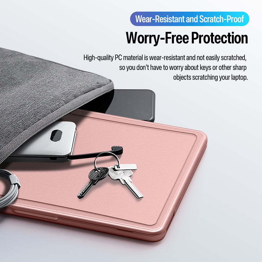 The dual-texture construction separates the coarse matte frame from the fine matte top cover across the two pieces. Furthermore, the coarse frame provides grip during handling while the fine top cover protects the lid surface. The precise cutouts on all sides keep every port, vent, and USB-C connector accessible without case removal. Moreover, the case does not affect the opening and closing angle of the laptop lid during use. The minimalist matte pink design keeps the MacBook Neo profile low during use and storage on any surface.