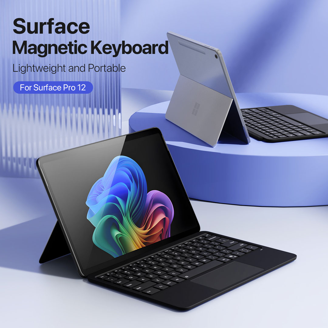 The keyboard fits the Microsoft Surface Pro 12 with magnetic alignment for connected mode and Bluetooth pairing for separated mode. Cutouts and magnetic contact points align with the Pro 12 chassis dimensions. The keyboard does not fit Surface Pro 11, Surface Pro 9 or earlier Surface Pro models, as those devices use different connector layouts and chassis widths. Therefore, buyers should confirm the tablet model before ordering. Additional tablet accessories are available in the accessories category.