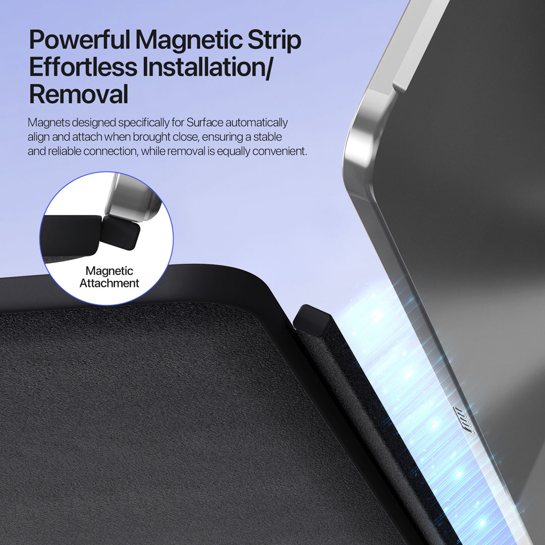 Magnetic connected and separated use is the main functional differentiator. Strong magnetic strips snap the keyboard to the Microsoft Surface Pro 12 for a laptop-style typing setup. In turn, detaching the keyboard activates Bluetooth 5.2 wireless mode with a working distance of 8 to 10 metres. Therefore, the keyboard supports desk work, lap use, presentations and remote navigation without a fixed connector. The 35-degree ergonomic tilt angle raises the key deck for extended typing sessions, while the flat angle mode keeps the profile low on crowded surfaces. Furthermore, the pull-out telescoping magnetic strip locks the tilt position in place.