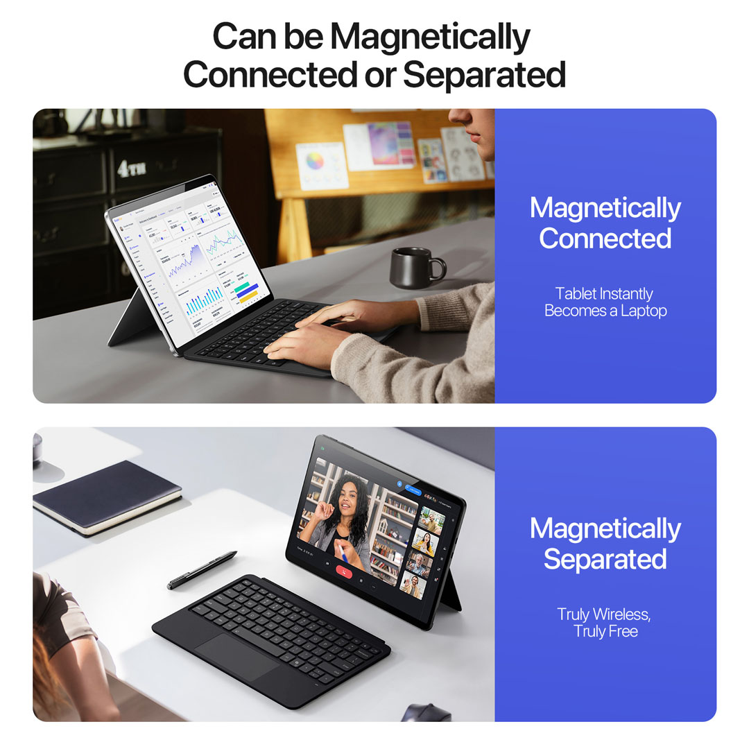 The keyboard supports Bluetooth 5.2 wireless mode with a working distance of 8 to 10 metres when detached. Connected magnetic mode also remains available for laptop-style use.