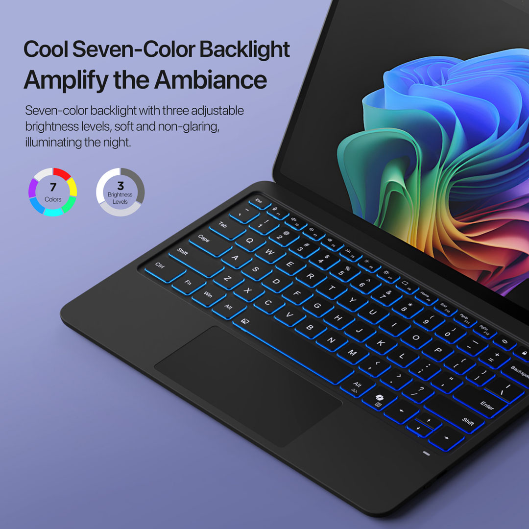Dux Ducis uses scissor-switch keys with 1.5mm travel across the full key deck. The 7-colour dynamic backlight offers 3 brightness levels for lower-light environments. Additionally, a function row spans the top of the keyboard for system shortcuts and media controls. The glass touchpad sits below the keys and supports gesture control, palm rejection, left click, right click, zoom and task switching. In turn, the touchpad gives the Microsoft Surface Pro 12 a laptop-grade navigation surface rather than relying on touchscreen input alone.
