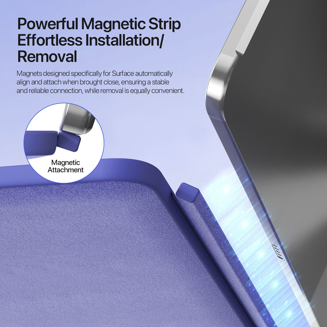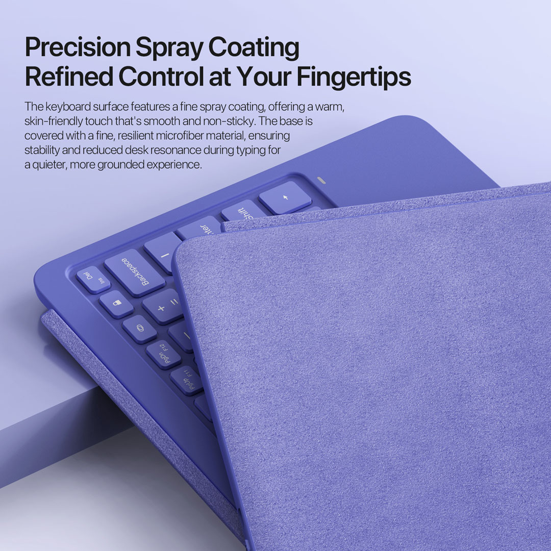 A dedicated pen slot above the keys stores the stylus in a fixed position during transport and desk use. The slot prevents the pen from rolling off a desk or getting lost inside a bag. Additionally, the 5mm body thickness and 378-gram weight keep the keyboard portable alongside the tablet. The purple finish offers a distinctive alternative to standard black or grey keyboards. The microfibre base also protects the Microsoft Surface Pro 12 screen from key contact marks when the keyboard folds against the display during carry.