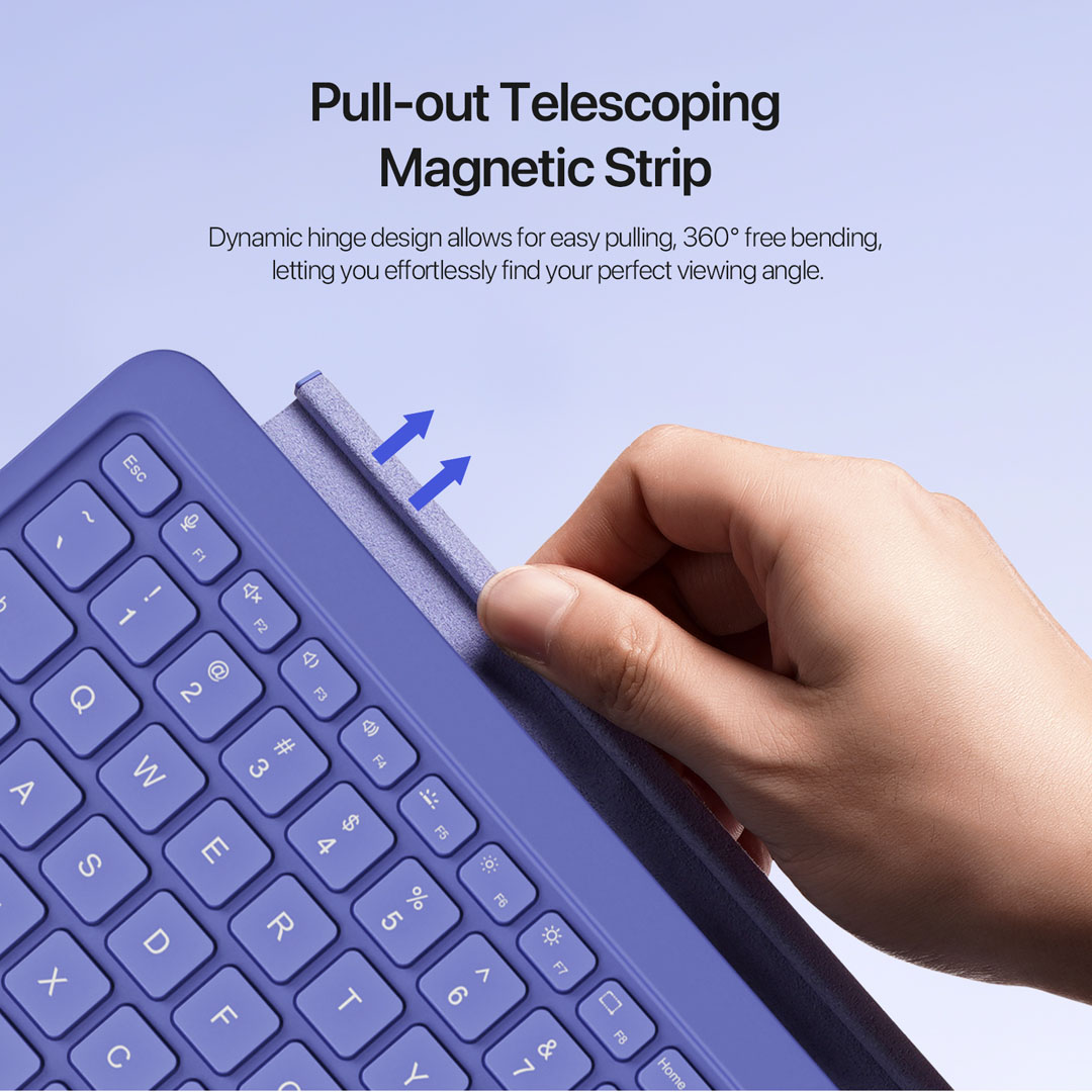 Magnetic connected and separated use is the main functional differentiator. Strong magnetic strips snap the keyboard to the Microsoft Surface Pro 12 for a laptop-style typing setup. In turn, detaching the keyboard activates Bluetooth 5.2 wireless mode with a working distance of 8 to 10 metres. Therefore, the keyboard supports desk work, lap use, presentations and remote navigation without a fixed connector. The 35-degree ergonomic tilt angle raises the key deck for extended typing sessions, while the flat angle mode keeps the profile low on crowded surfaces. Furthermore, the pull-out telescoping magnetic strip locks the tilt position in place.