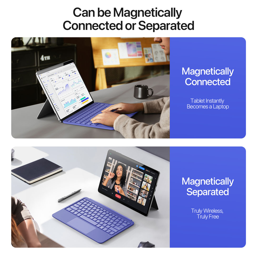 The keyboard supports Bluetooth 5.2 wireless mode with a working distance of 8 to 10 metres when detached. Connected magnetic mode also remains available for laptop-style use.