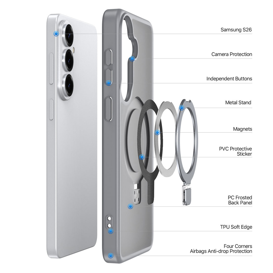 This magnetic frosted stand case fits Samsung Galaxy S26. Therefore, the shell shape, camera opening, and side access match Samsung Galaxy S26.