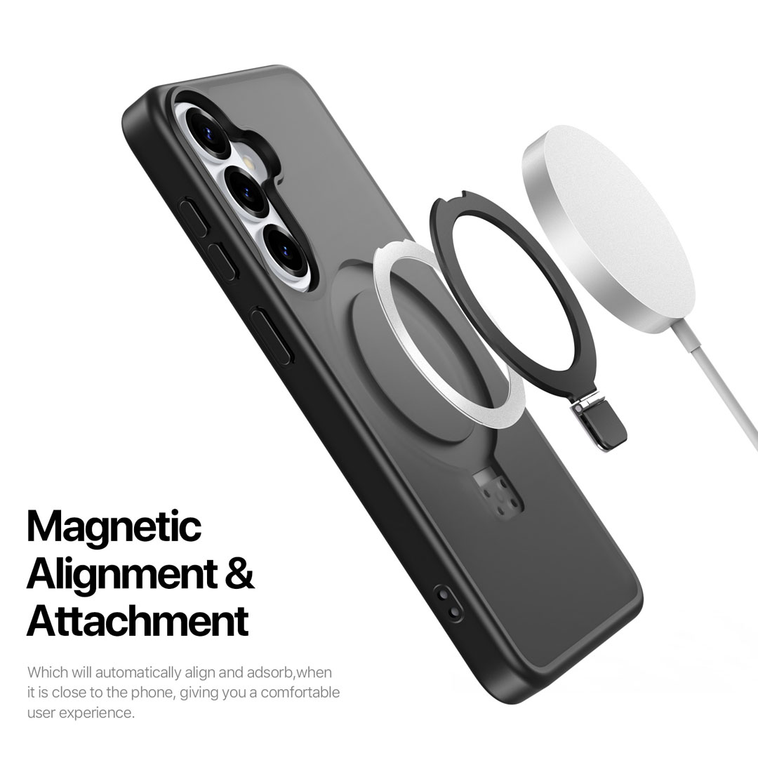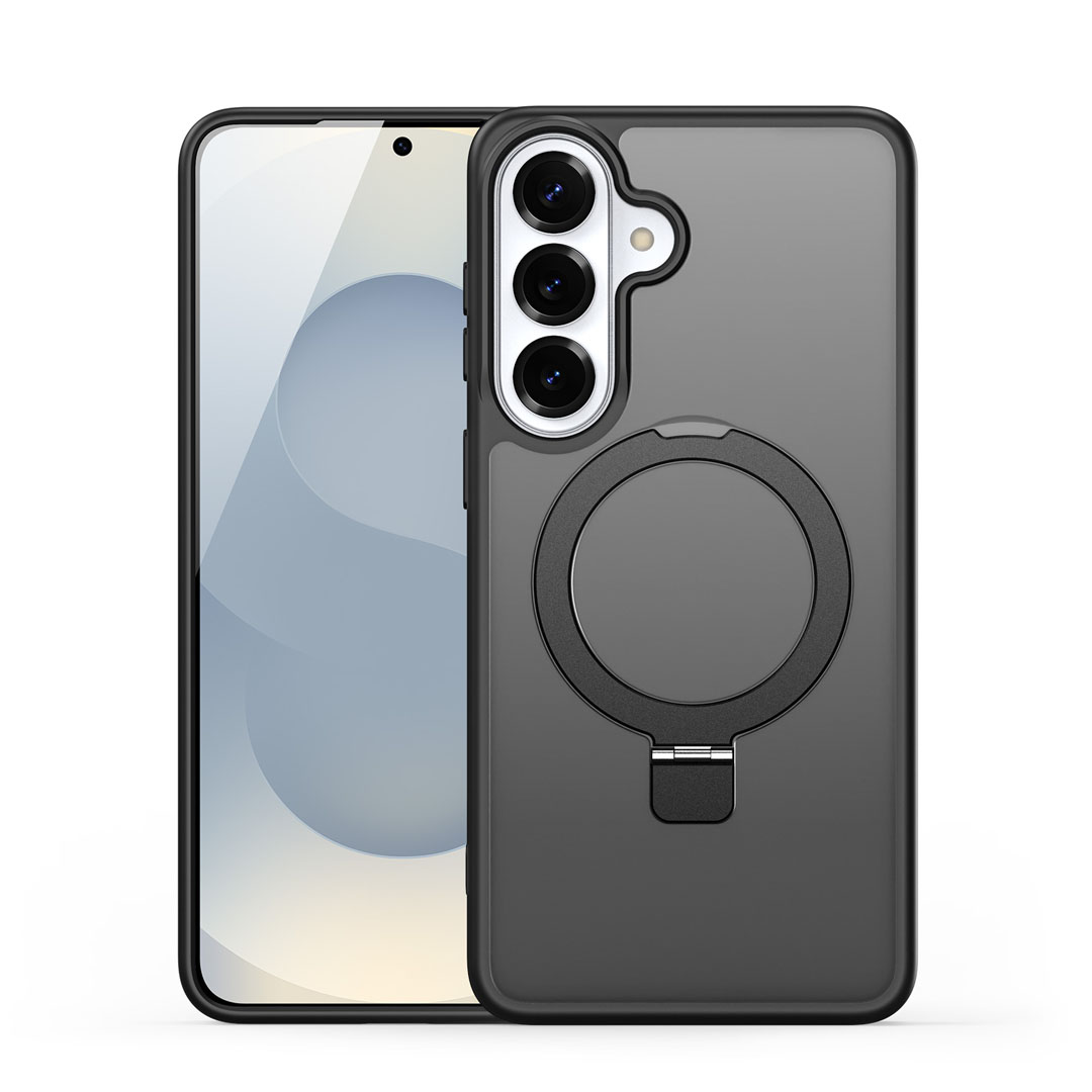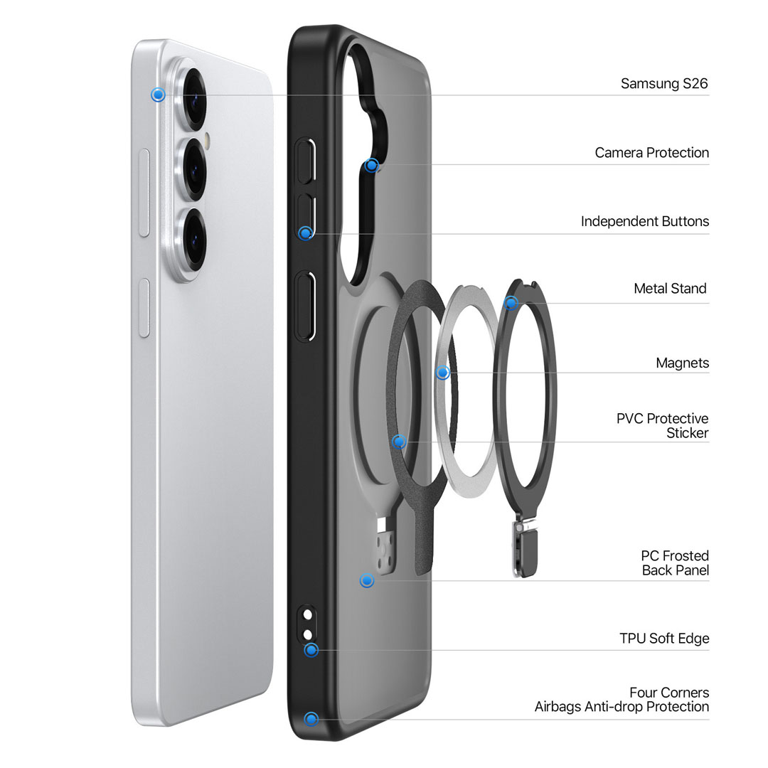 This magnetic frosted stand case fits Samsung Galaxy S26. Therefore, the shell shape, camera opening, and side access match Samsung Galaxy S26.
