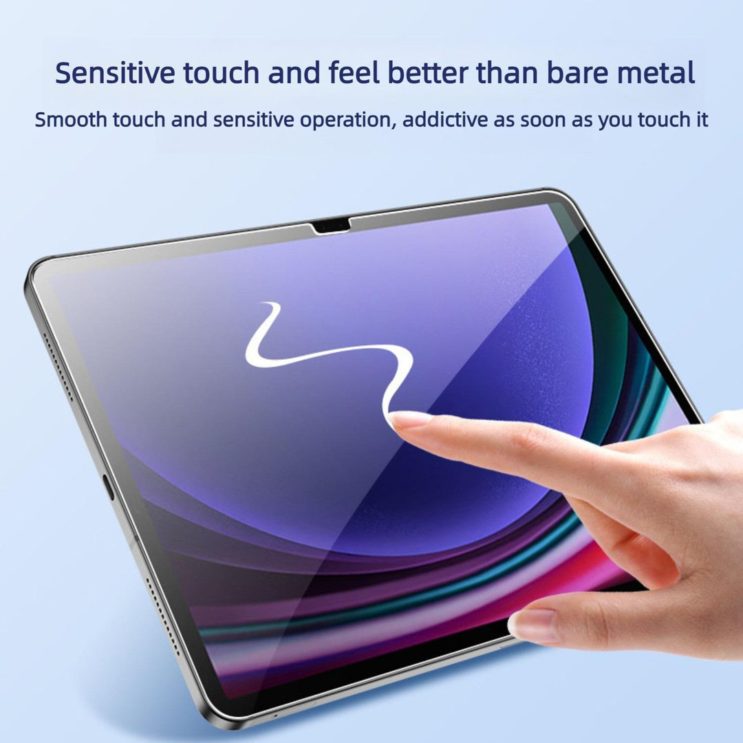 The Samsung Tab S10 FE+ screen protector is 0.33mm thick. Because the slim profile sits close to the panel, taps and swipe gestures stay close to the bare-display 90Hz response, while the 9H tempered glass surface still resists scratches from everyday objects.